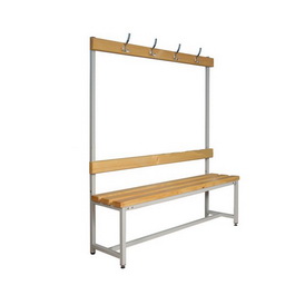 Каркас – из крепкого стального прямоугольного профиля 30х30 мм. Окрашен порошковой краской RAL 7035. Очень прочные и долговечные скамейки для раздевалок со спинкой и вешалкой. Все элементы скамеек отличаются надёжностью, скамьи практичны и неприхотливы в эксплуатации. Полимерное защитно-декоративное покрытие, особо прочное, коррозионно-стойкое, устойчиво к перепадам температуры. Сиденье скамьи – три массивные доски (древесина хвойных пород толщиной 30 мм). Скамейка снабжена спинкой и вешалкой, стойка к влаге, и большим нагрузкам, что обусловливает широкий диапазон условий её использования. Скамья – цельнометаллическая или разборная, конструкционные элементы её скрепляются с помощью винтов и стяжек М6. На неровной поверхности скамья легко выставляется ровно благодаря возможности плавной регулировки ножек по высоте.