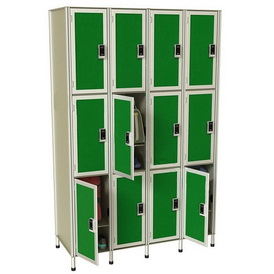 Влагостойкий шкаф для раздевалки состоит из 4-х секций по 3 ячейки (общее количество ячеек в модуле – 12 шт.)