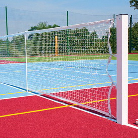 Стойки изготовлены из специального усиленного ребрами жесткости алюминиевого квадратного профиля 80х80 мм. Стойки оборудованы внутренним винтовым механизмом для натяжения сетки Алюминиевые стойки монтируются при помощи закладных элементов, что позволяет демонтировать их после окончания игры и перенести в помещение для хранения.