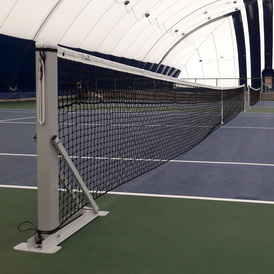 Изготовлены из алюминиевого квадратного профиля 80х80 мм., стойки крепятся к основанию корта при помощи анкеров. Натяжной механизм находится внутри стойки, за счет этого он защищен от различных повреждений.