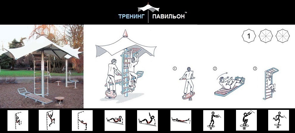 Новая культура тренировочных упражнений на свежем воздухе. Тренировки могут проходить индивидуально или в группах. Наши тренинг павильоны сочетают в себе современный дизайн с функциональностью и прочностью. Высокие требования к долговечности и простоте инструментов идеально подойдут для создания, открытого фитнес-зал с тренажерами. Прочная конструкция основания и механизмы очень надежные, имеют высокую степень защиты от вандализма и разработан таким образом, что они требуют минимального технического обслуживания. Крыша служит защитой от дождя и защищает от вредного воздействия солнечных лучей. Каждый павильон имеет набор тренажеров и дополнительных различных инструментов, которые могут быть использованы для тренировки всех групп мышц. Комплекс состоит из трех павильонов, каждый дополняет друг друга.