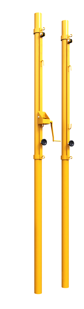 Стойки изготовлены из стальной трубы, диаметром 76 мм. Стойки оборудованы механизмом натяжения и регулировкой по высоте с помощью барашков. Возможность свободной регулировки высоты сетки в интервале 1,07-2,55 м позволяет использовать стойки для игры в волейбол а также бадминтон.