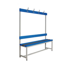 Каркас – из крепкого стального прямоугольного профиля 30х30 мм. Окрашен порошковой краской RAL 7035. Очень прочные и долговечные скамейки для раздевалок со спинкой и вешалкой. Все элементы скамеек отличаются надёжностью, скамьи практичны и неприхотливы в эксплуатации. Полимерное защитно-декоративное покрытие, особо прочное, коррозионно-стойкое, устойчиво к перепадам температуры. Сиденье скамьи – три массивные доски (древесина хвойных пород толщиной 30 мм). Скамейка снабжена спинкой и вешалкой, стойка к влаге, и большим нагрузкам, что обусловливает широкий диапазон условий её использования. Скамья – цельнометаллическая или разборная, конструкционные элементы её скрепляются с помощью винтов и стяжек М6. На неровной поверхности скамья легко выставляется ровно благодаря возможности плавной регулировки ножек по высоте.